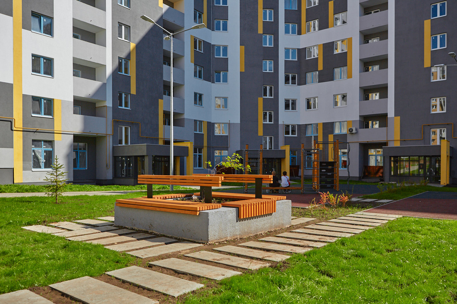 Все подъезды в домах, где удалось реализовать дворы без машин мы специально сделали сквозными, чтобы в квартиру можно было попасть как из двора, так и с зоны парковки. Вы спросите, а как же пожарная техника? Об этом мы тоже позаботились и укрепили пешеходные дорожки для проезда пожарной техники, в экстренных случаях пожарные машины беспрепятственно попадут в необходимую точку двора.