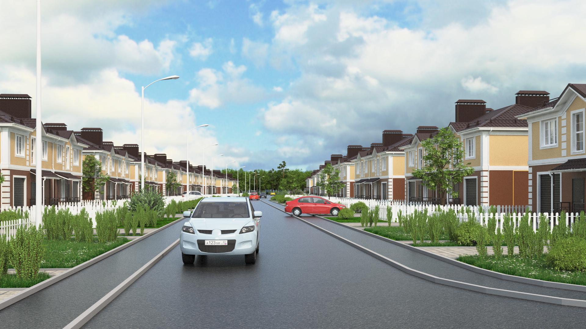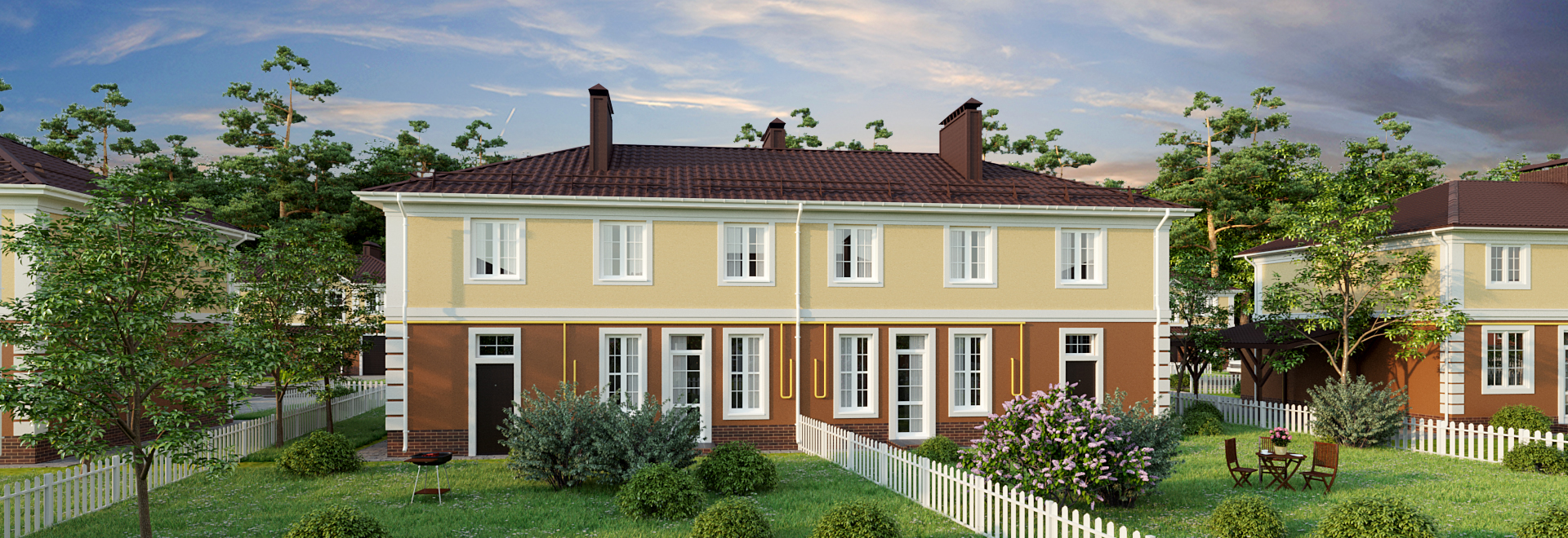 У каждой квартиры в доме есть собственный земельный участок, огороженный аккуратным заборчиком.
