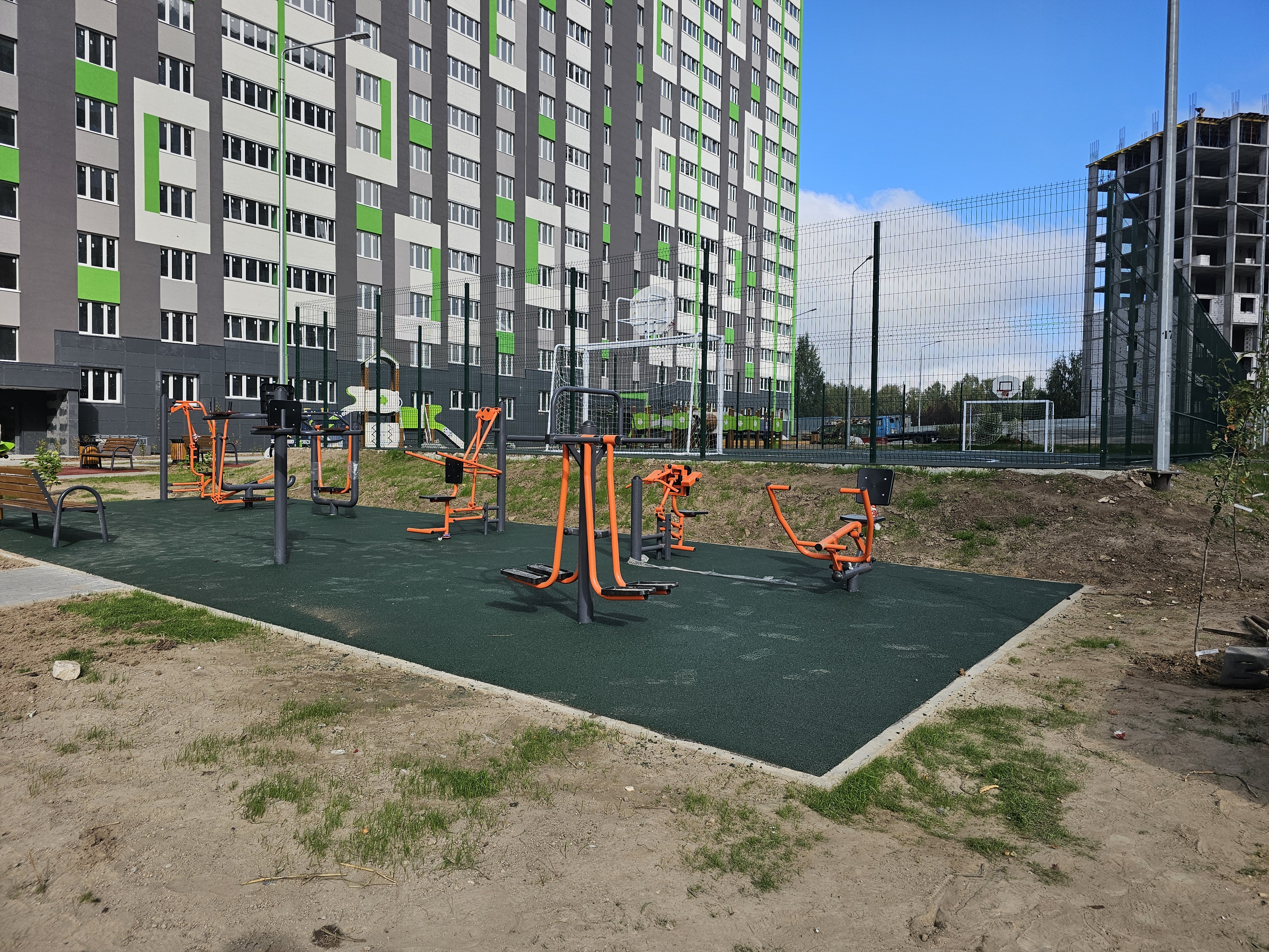 Особое внимание — комфорту и безопасности будущих жителей. Детские и спортивные площадки оснащены современным резиновым покрытием — мягким, износостойким и абсолютно безопасным. Всё оборудование установлено, зоны оформлены с заботой о каждом возрасте — от малышей до взрослых. Они уже ждут своих первых героев!